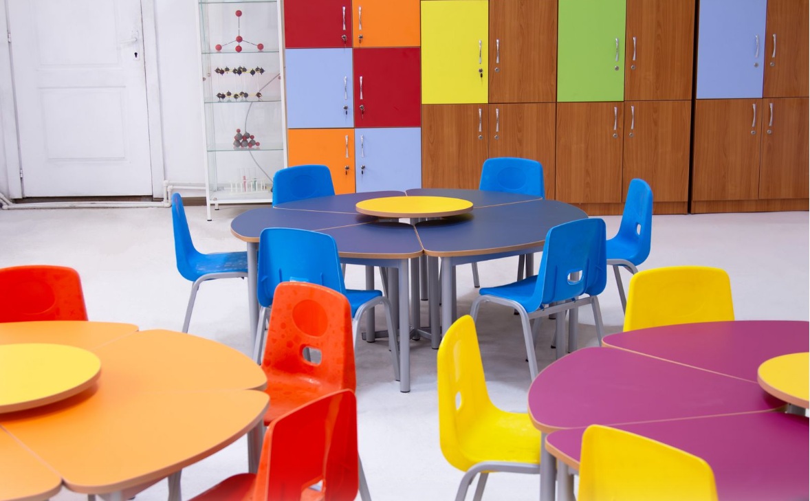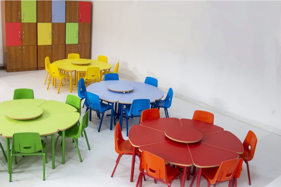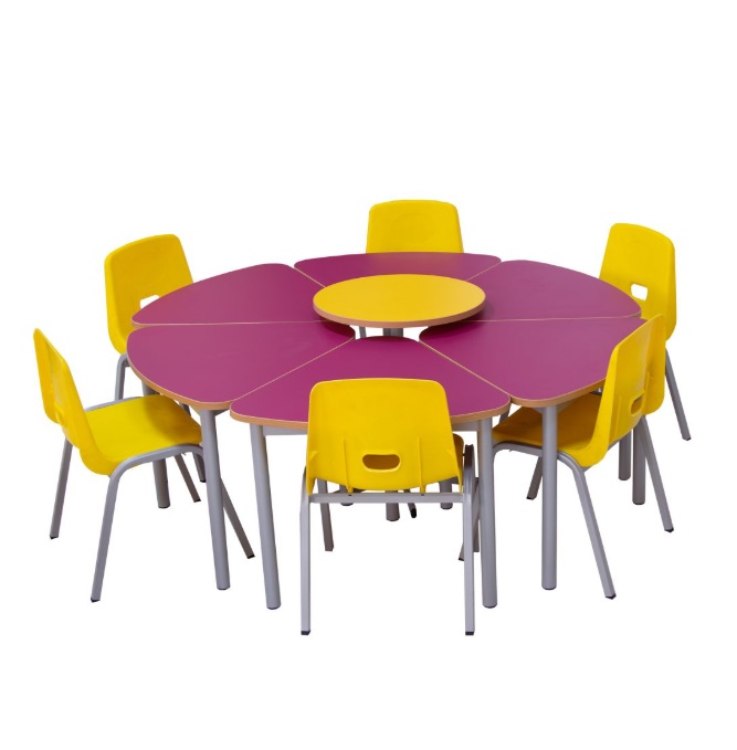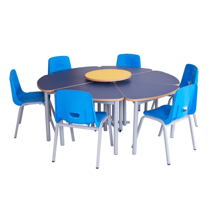 Ansamblul este format din 6 masute si un modul central, pe schelet metalic, vopsit electrostatic, culoare gri si blaturile din PAL 18 mm colorat, cantuit cu ABS.