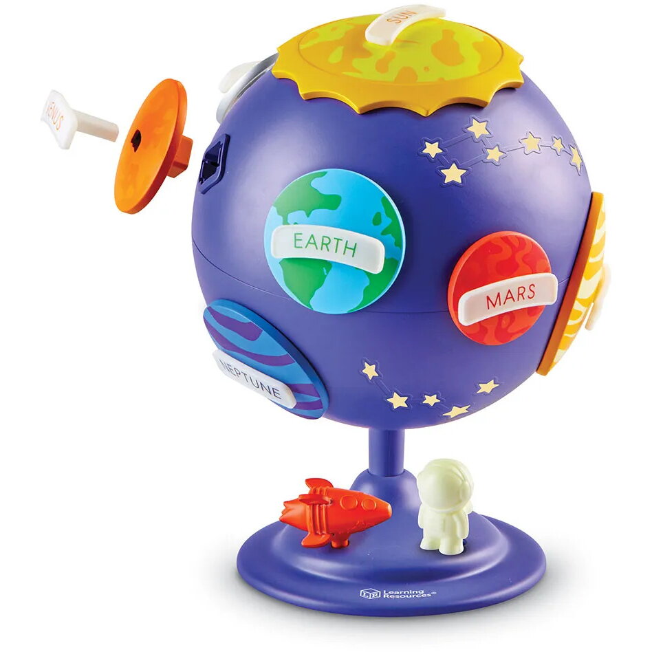 Fabricate din plastic durabil în culori strălucitoare, planetele și soarele se atașează de glob și sunt fixate folosind piese de puzzle cu nume de planete.