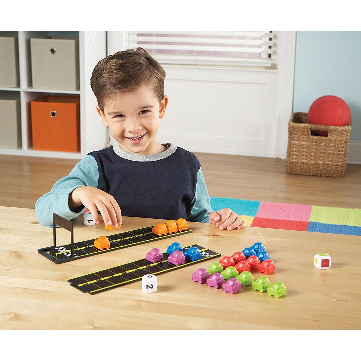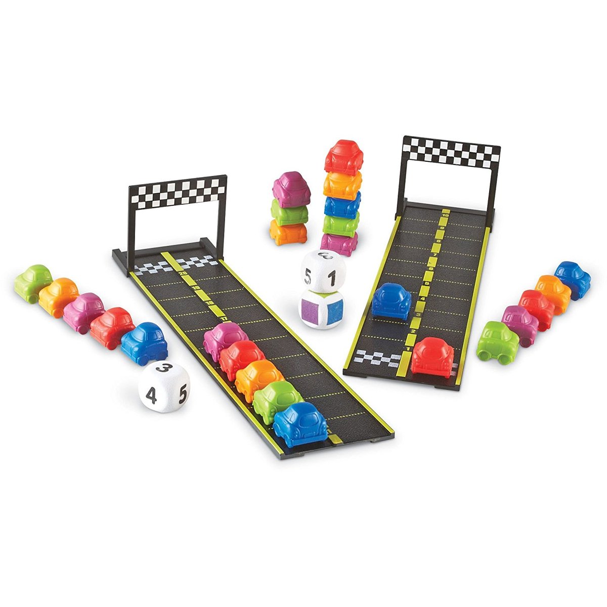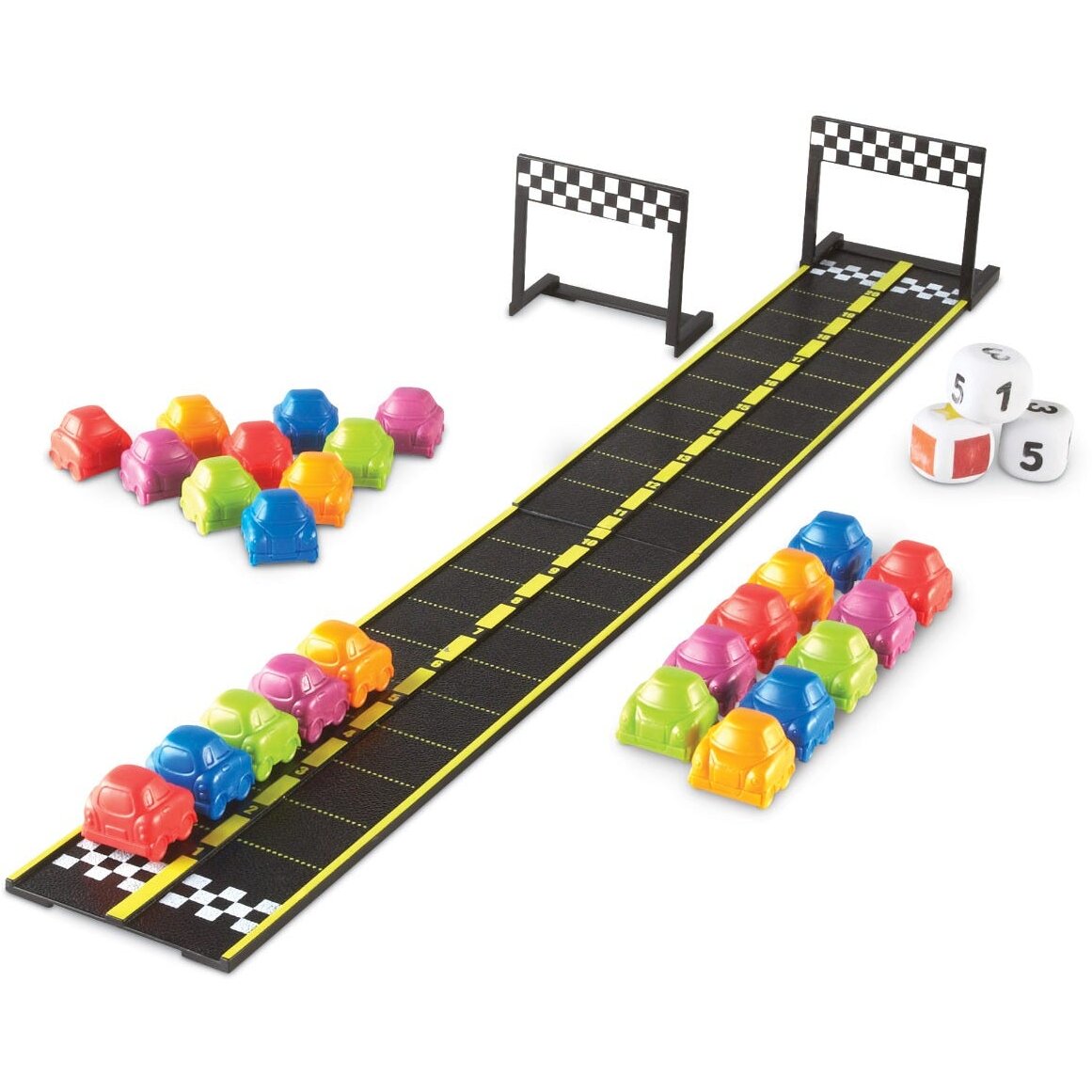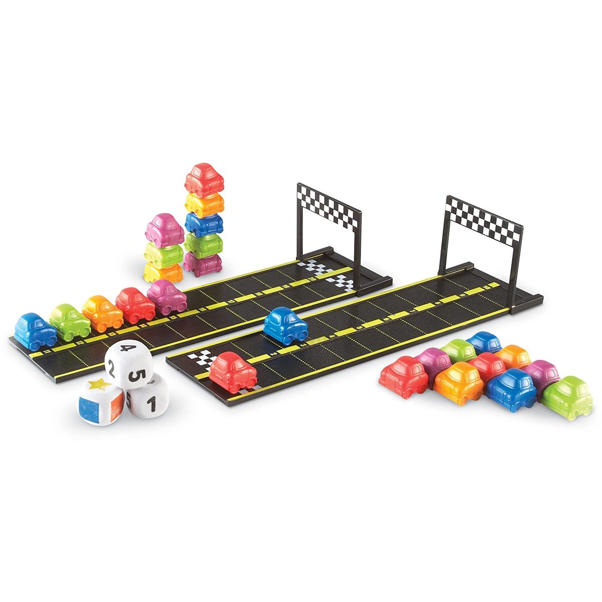 Cine crezi ca va castiga cursa? Variantele de joc sunt multiple! Foloseste zarul colorat pentru a vedea ce masinuta trebuie sa alegi si deplaseaza-te atatea spatii cat reprezinta cifra afisata pe zar sau foloseste ambele zaruri cu numere si aduna valoarea cifrelor afisate pentru a vedea cate spatii poti avansa.