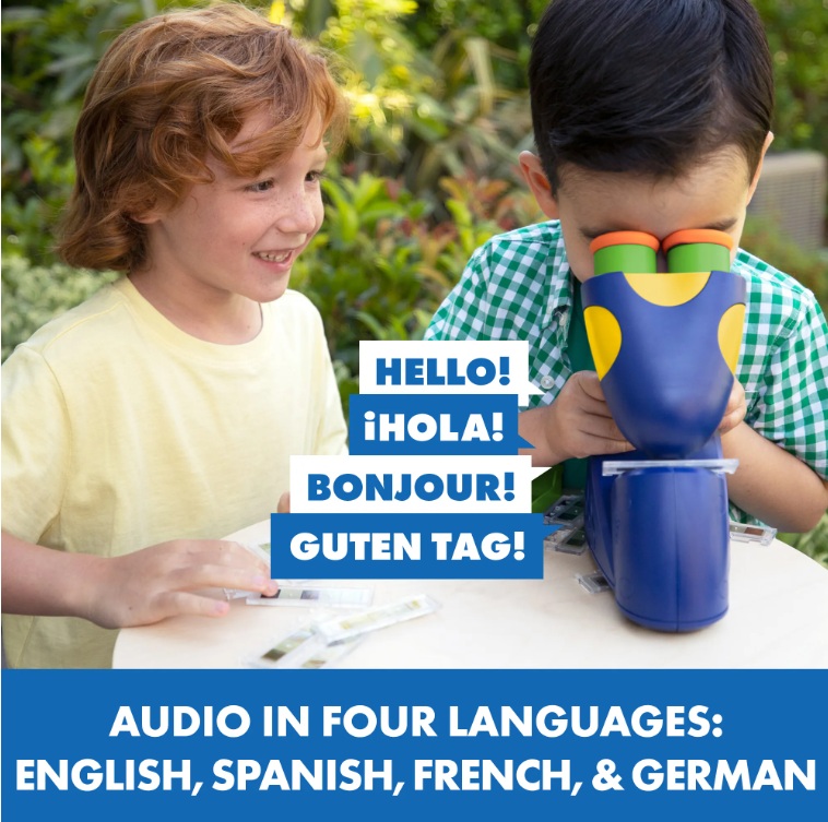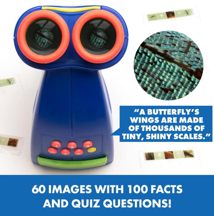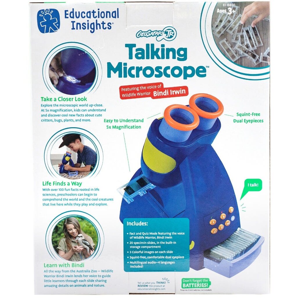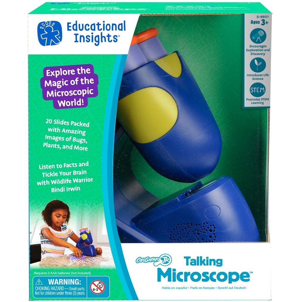 - Microscopul inculde: 20 de lame cu 60 de imagini ce includ animale, plante si itemi din casa; tavita pentru depozitarea lamelor ce se potriveste in interiorul microscopului
