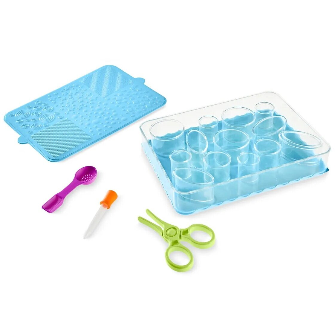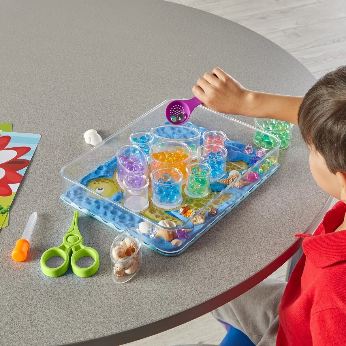 - folositi paharele de sortare si instrumentele de motricitate incluse in set cu o varietate de materiale, cum ar fi: apa, nisip, bilele de apa, leguminoase uscate si multe altele